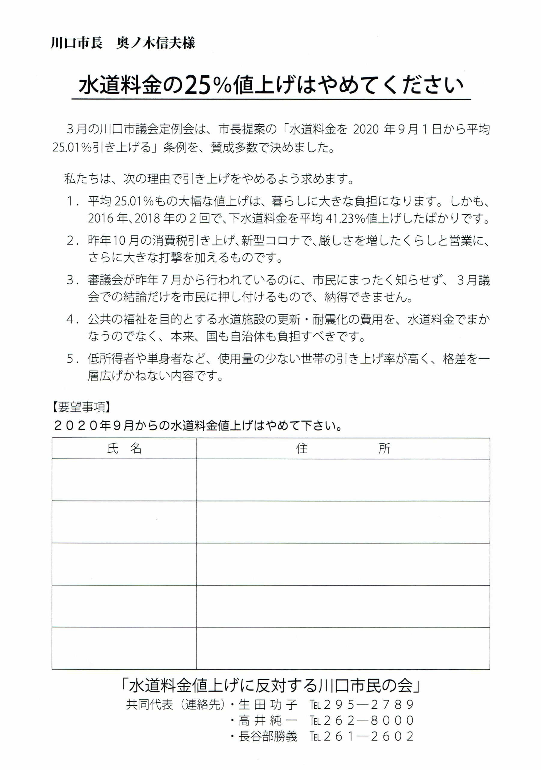 川口市水道料金値上げ反対の署名お願い